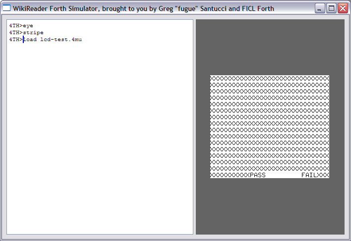 I bought a WikiReader recently, which apart from being a 4GB text only offline version of Wikipedia, comes with a fun feature where it can run any Forth programs which are placed on its internal mini SD card. I wrote this program so I could test my small Forth programs without having to swap the mini SD card in and out repeatedly. The current version can run most of the test programs exactly as they appear on the SD card very faithfully. This app uses a Forth interpreter provided by the open source embeddable Forth implementation FICL (http://ficl.sourceforge.net/), and it works by providing device specific words as callbacks to a simulated WikiReader. It implements enough now to be useful, including the framebuffer functions, GDI functions (including text rendering using the device's font) and input functions, so I'm releasing it.